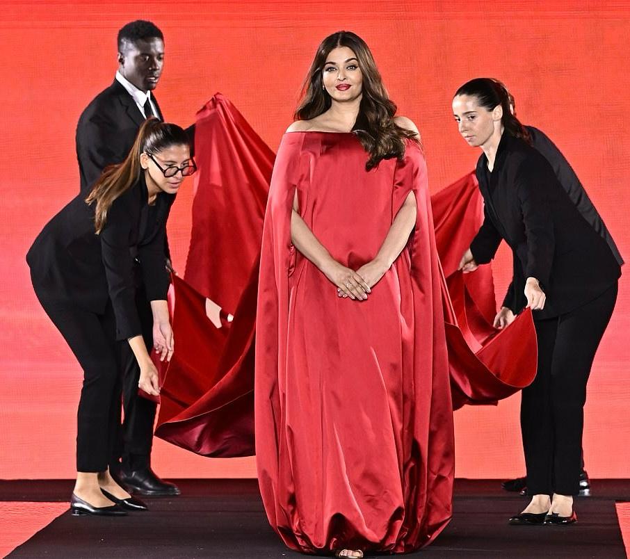 نجمة بوليوود، آيشواريا راي، بدت فاتنة بفستانٍ طويل مكشوف بنمط الرداء Cape Dress من ساتان الحرير الأحمر اللون، تميّز بقصّة واسعة ومنفوخة، مزمزمة من الأسفل ومكشوفة الكتفيْن من علامة MOSSI.