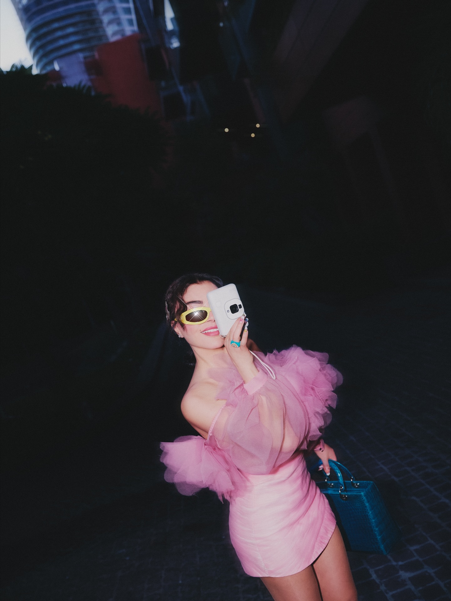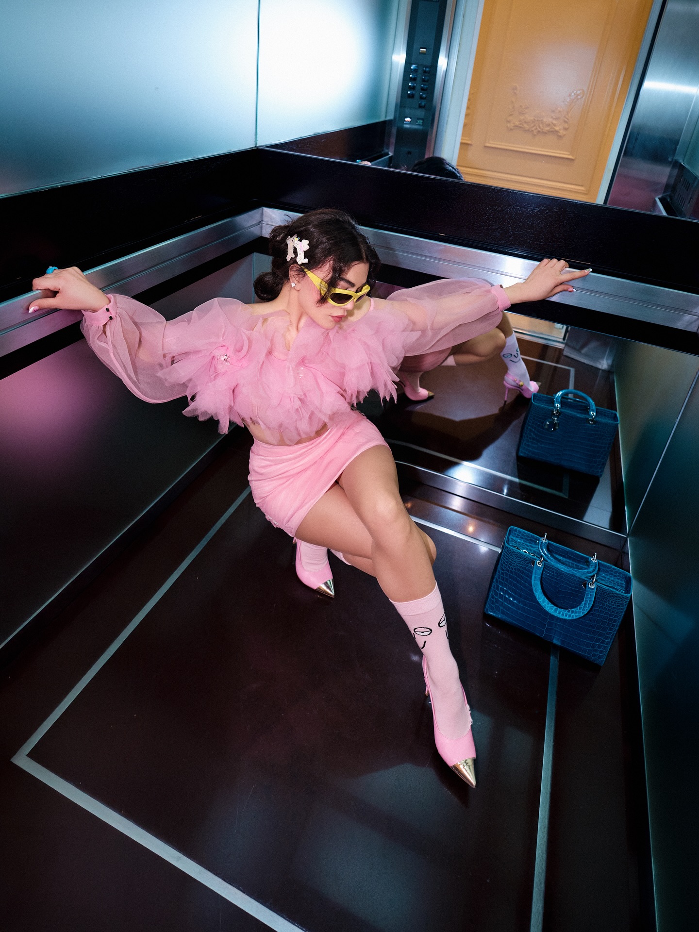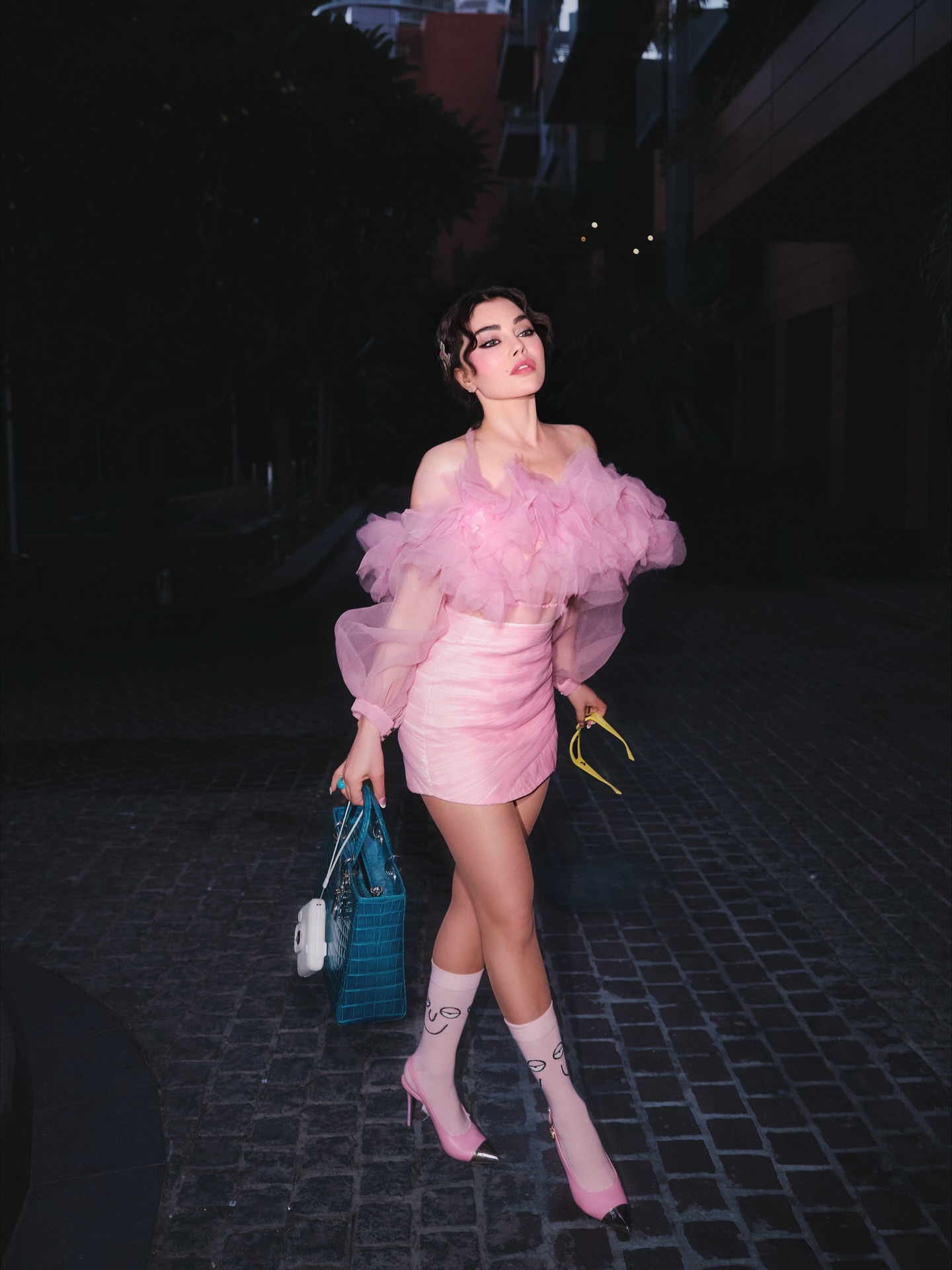 هذه الإطلالة أقرب إلى نمط "باربي" (Barbiecore) ولكن بأسلوب هيفاء الخاص... مزيج من الجرأة، المرح والترف.