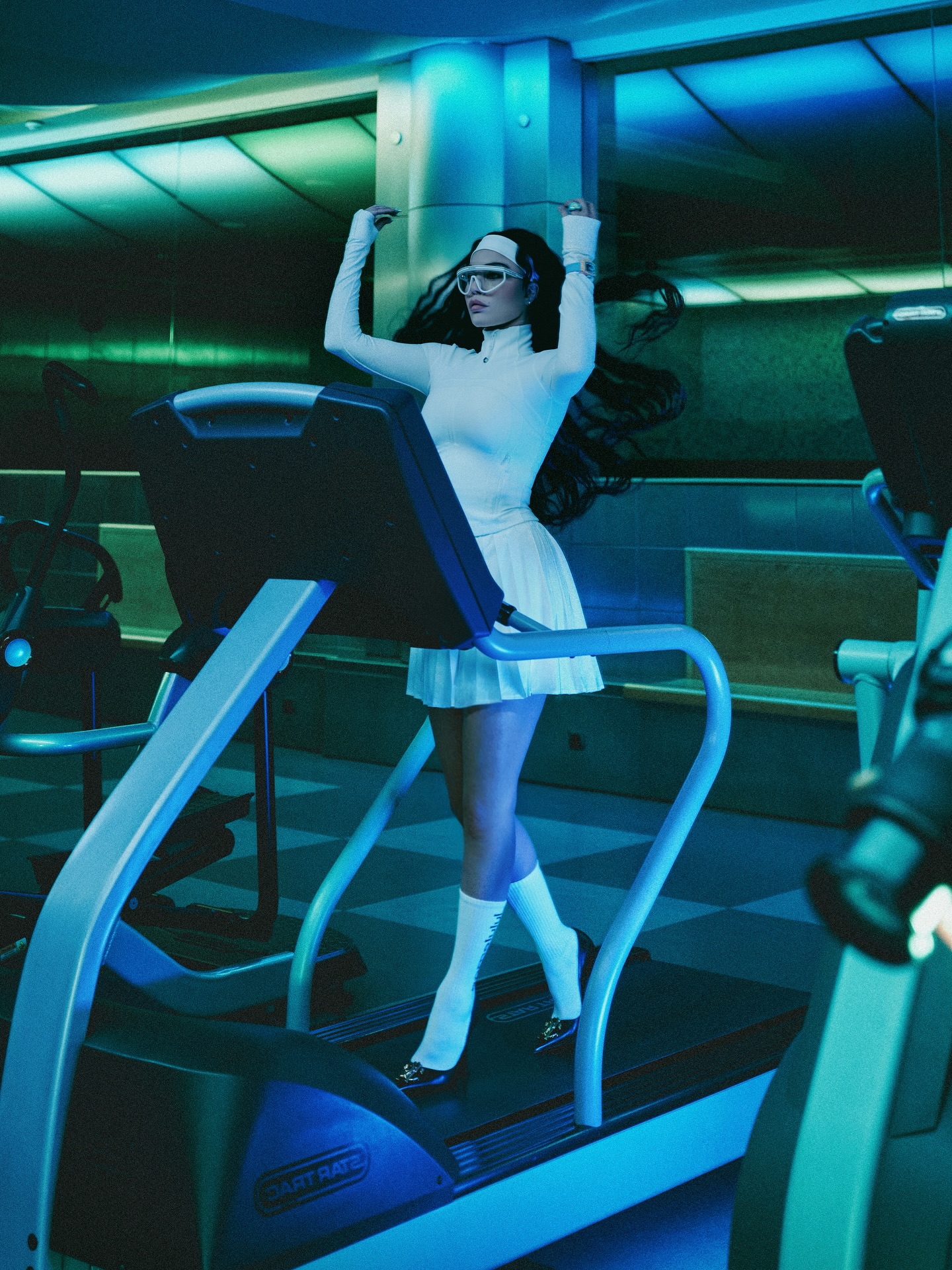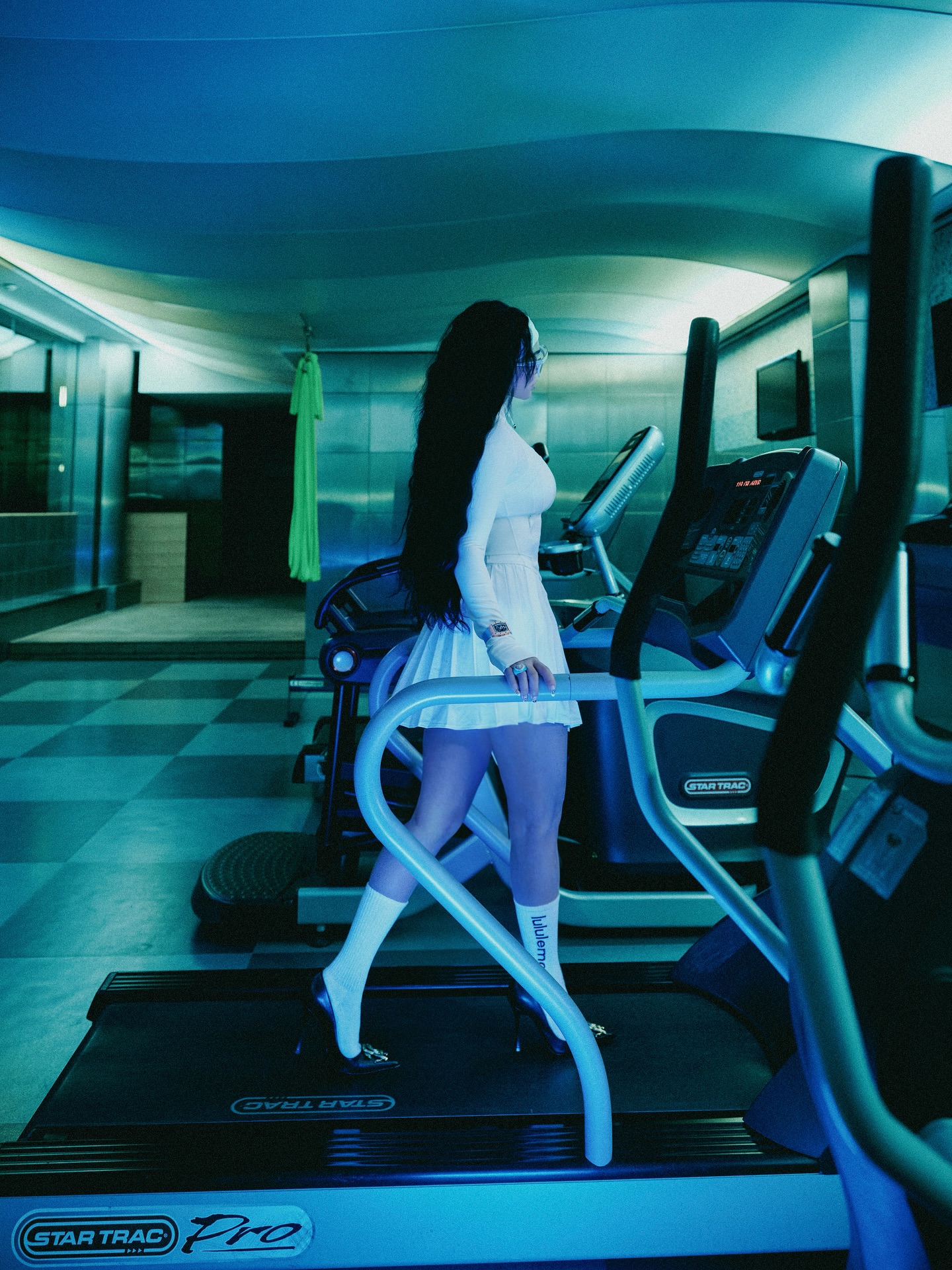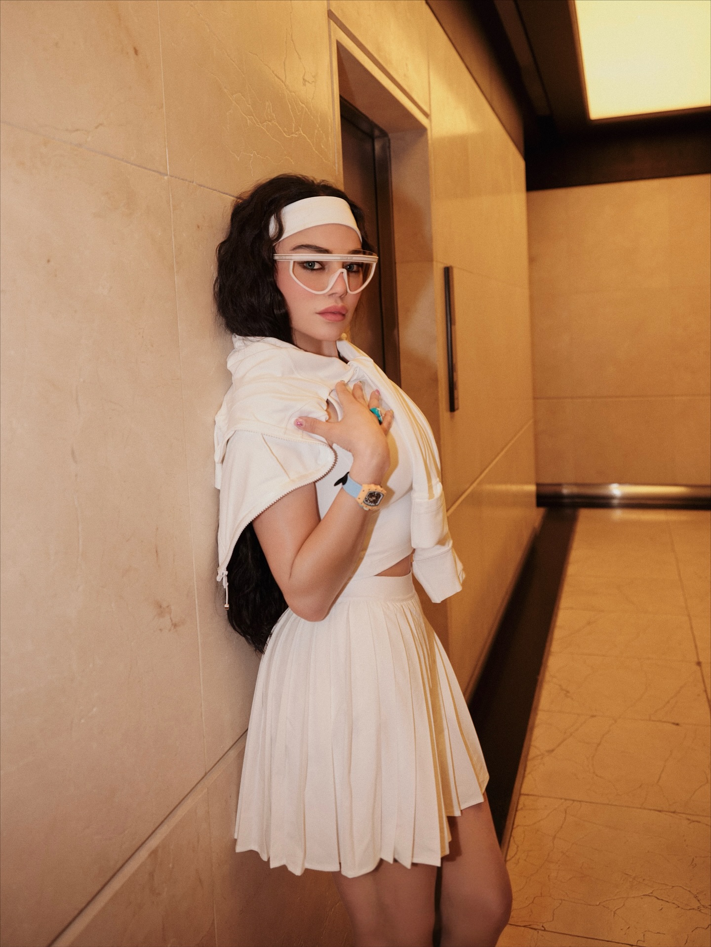 في إطلالة مختلفة كلياً داخل نادٍ رياضيّ، أطلّت بملابس رياضيّة عصريّة باللون الأبيض، مؤلفّة من تنّورة "تنس" قصيرة جداً وواسعة بتفصيل الثنيات العريضة، و"توب" باللون نفسه بتفصيل سحّاب وياقة عالية كلاهما من علامة (Lululemon)، وأكملت إطلالتها مع نظّارات شمسيّة كتلك المخصّصة لرياضة التزلج. كذلك، انتعلت كندرة مدبّبة من الجلد الأسود اللمّاع بكعبٍ عالٍ ومزيّنة بإكسسوار معدني من (Roberto Cavalli) مع جوارب رياضيّة قصيرة من القطن الأبيض من علامة زيّها.
