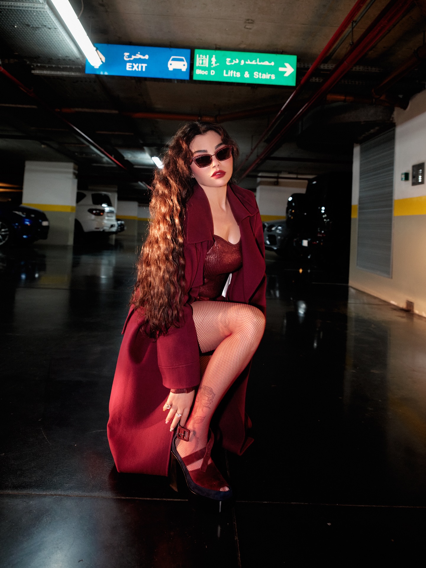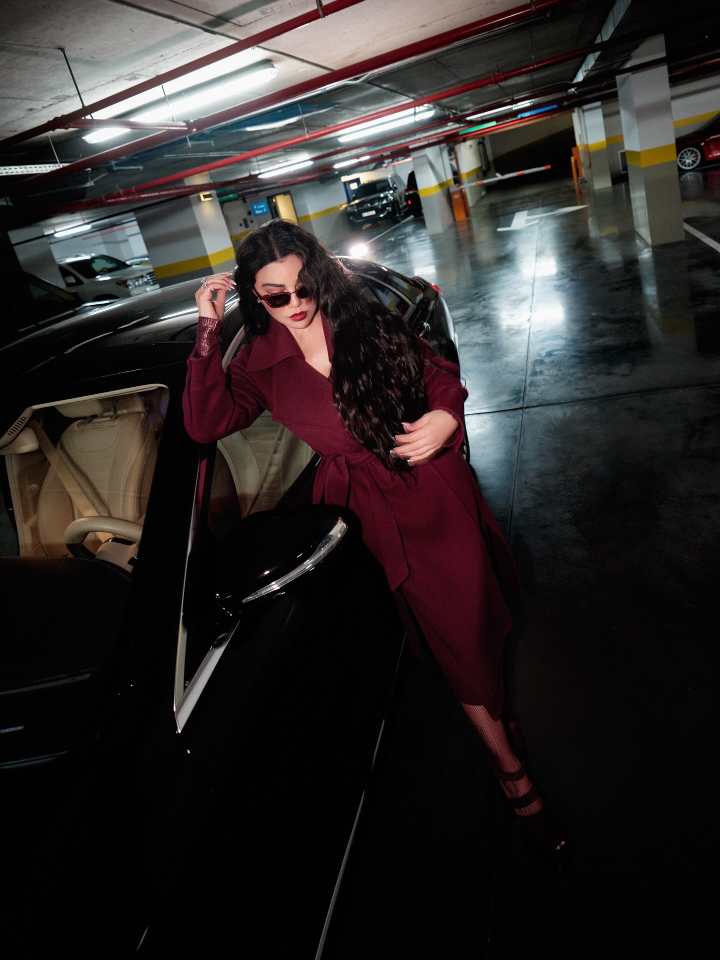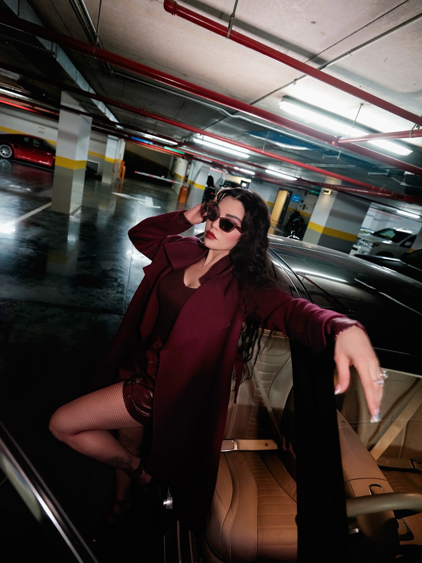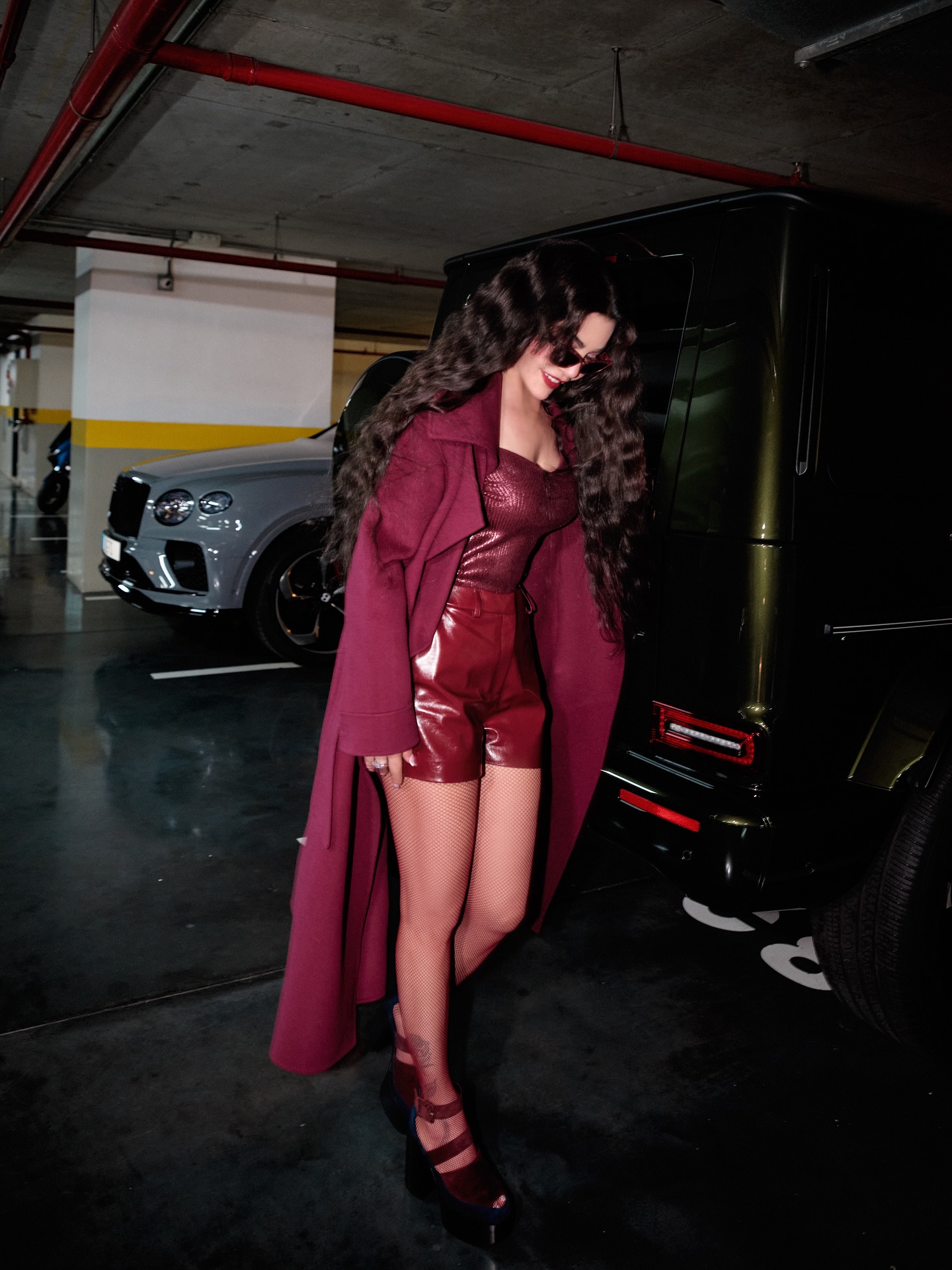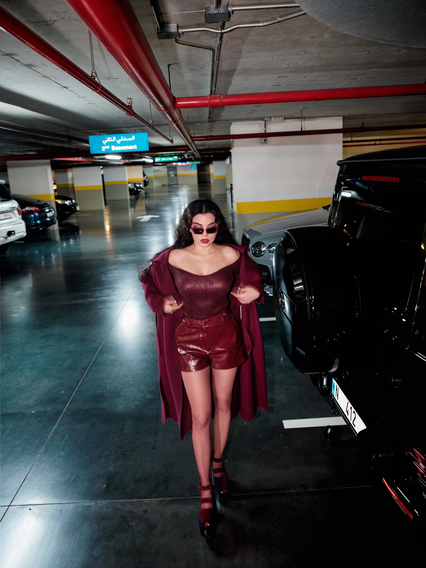 نشرت هيفاء وهبي مجموعة صور من جلسة تصوير جديدة لها، متأنّقة بنمط مونوكروم جريء بلون البرغندي الملكيّ. واشتملت إطلالتها على سروالٍ قصيرٍ جداً بقصّة خصر عالية من الجلد، نسّقته مع "بودي" مكشوف الكتفين ومعطف طويل مضاد للمطر. كذلك، ارتدت جوارب نسائيّة شبكيّة مع صندالٍ من الجلد المخمليّ اللون بلون زيّها مع تفصيل باللون الأزرق يكاد يظهر في أسفل الحذاء الذي اختارته من علامة "هيرمس" (Hermès). ولمزيد من الغموض، حجبت هيفاء عينيها بنظّارات شمسيّة داكنة.