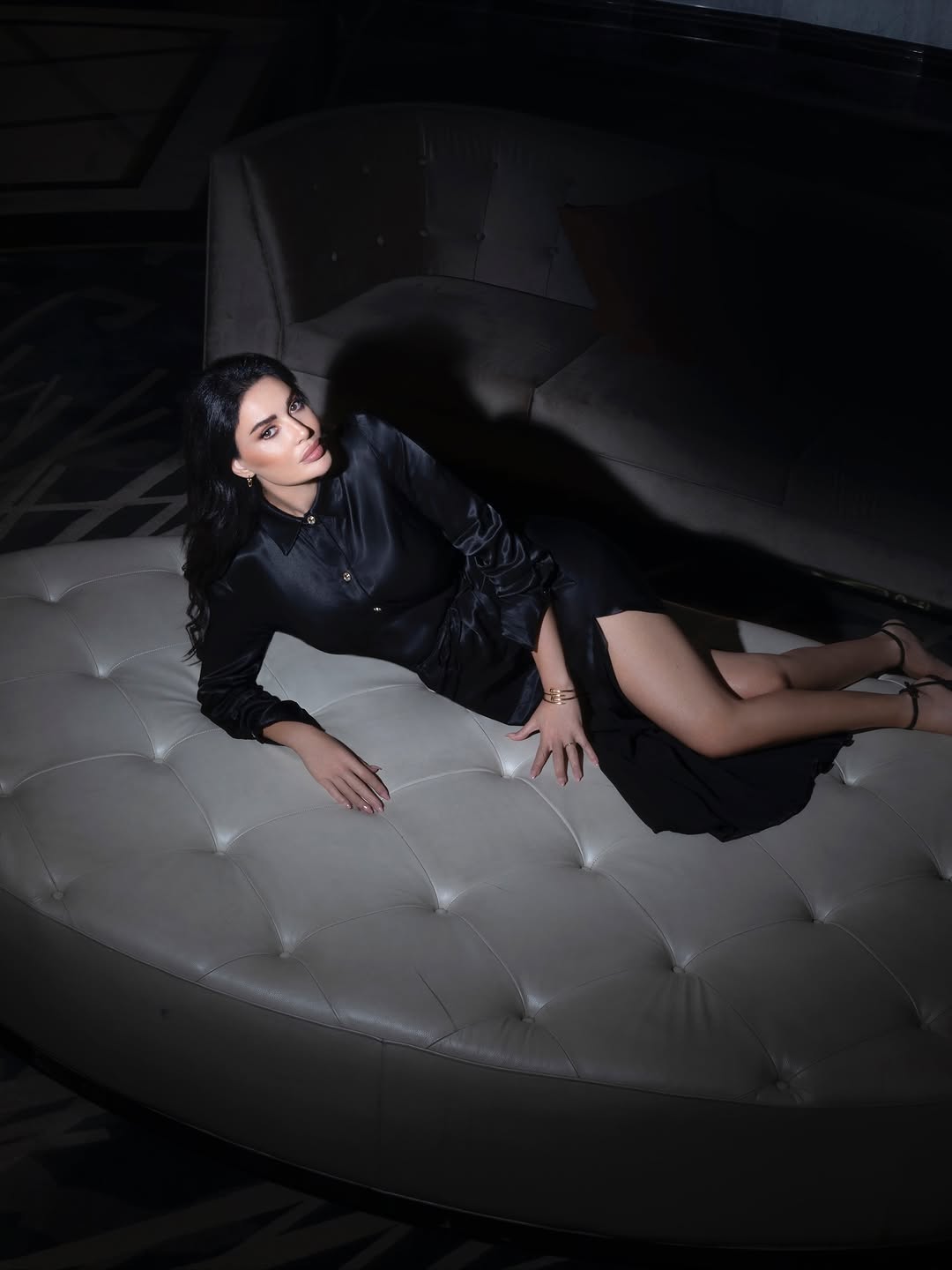 يعكس أسلوبها هذا توجّهاً واضحاً نحو موضة الـ (Shirt Dress) الراقية، التي تجمع ما بين حضور عملي يناسب الإطلالات اليومية، ولمسة مسائية ناعمة تليق بجلسة تصوير تعتمد على لغة الصورة والضوء. وقد تميّز أيضاً بفتحة أمامية عميقة بيّنت قوامها بأنوثة راقية.