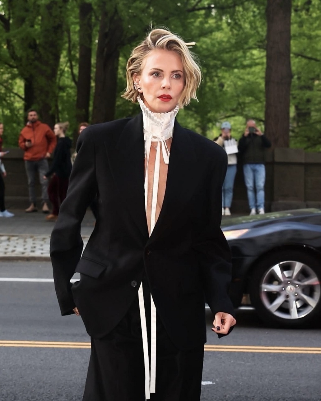 اختارت النجمة الهوليووديّة، تشارليز ثيرون، بدلة كلاسيكيّة سوداء من دار "ديور" Dior  تميّزت بخياطة نظيفة وخطوط مشغولة بدقّة، ارتدتها من دون قميص أو توب، وقامت بتنسيقها بأسلوب غير متوّقع مع ياقة بيضاء مستوحاة من الموضة الفيكتوريّة. القصّة المريحة للسترة والسروال المستقيم منحا الإطلالة  حضوراً يعكس الثقة والسيطرة، بينما أعطى غياب القطعة العلوية التقليدية انطباعاً برغبة النجمة في تحدّي المألوف، والتعبير على الاستقلالية وكسر القيود.