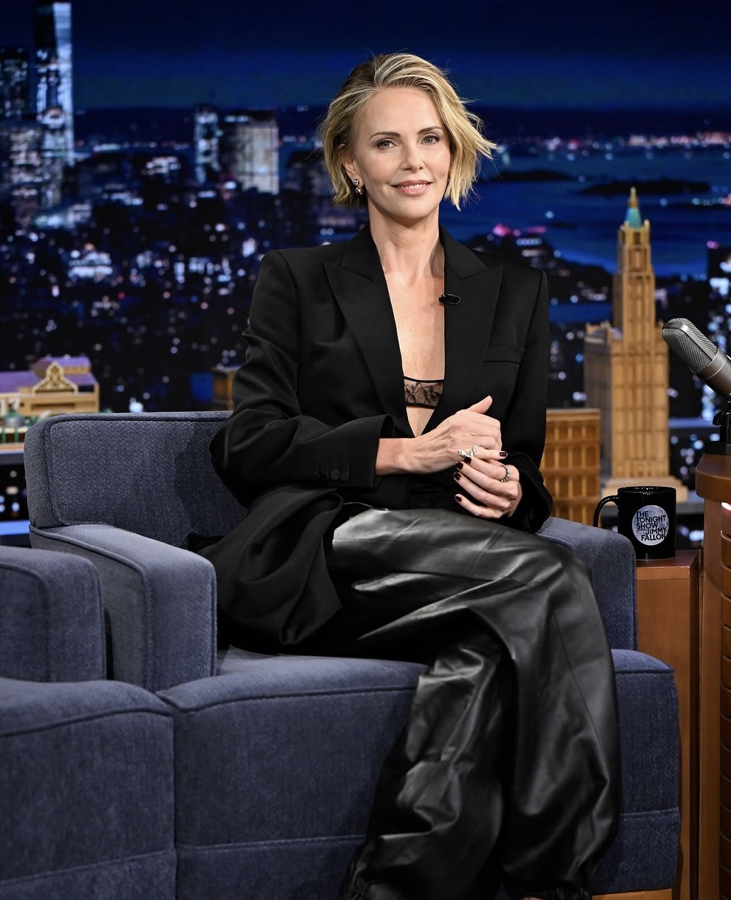 لم تكن هذه الإطلالة الوحيدة لتشارليز ثيرون في نيويورك التي شغلت متتبعي الموضة وعشّاق الأسلوب المتميّز حول العالم. فقد سبق أن أطلّت تشارليز في برنامج جيمي فالون ببدلة سوداء شملت سترة بقصّة مريحة وسروالاً واسعاً من الجلد، نسّقتهما مع حمّالة صدر من الدانتيل، وصندل بتفصيل فيونكة (Ribbon Mules) من "جيفنشي" (Givenchy).