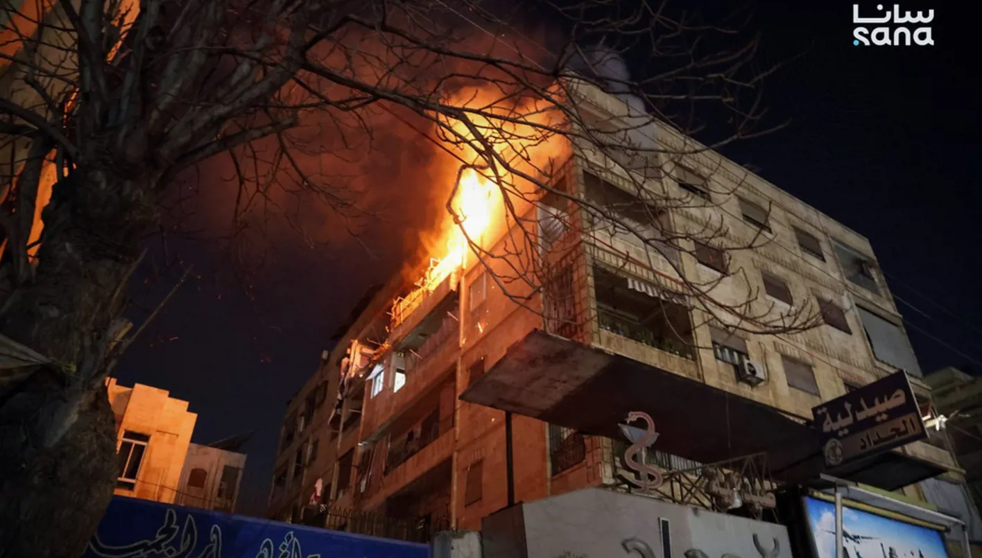 This photo released by the official Syrian news agency SANA, shows flames rising from a building after clashes broke out between security forces and Kurdish fighters in neighborhoods of the northern Syrian city of Aleppo, Syria, Monday, Dec. 22, 2025. (SANA via AP)