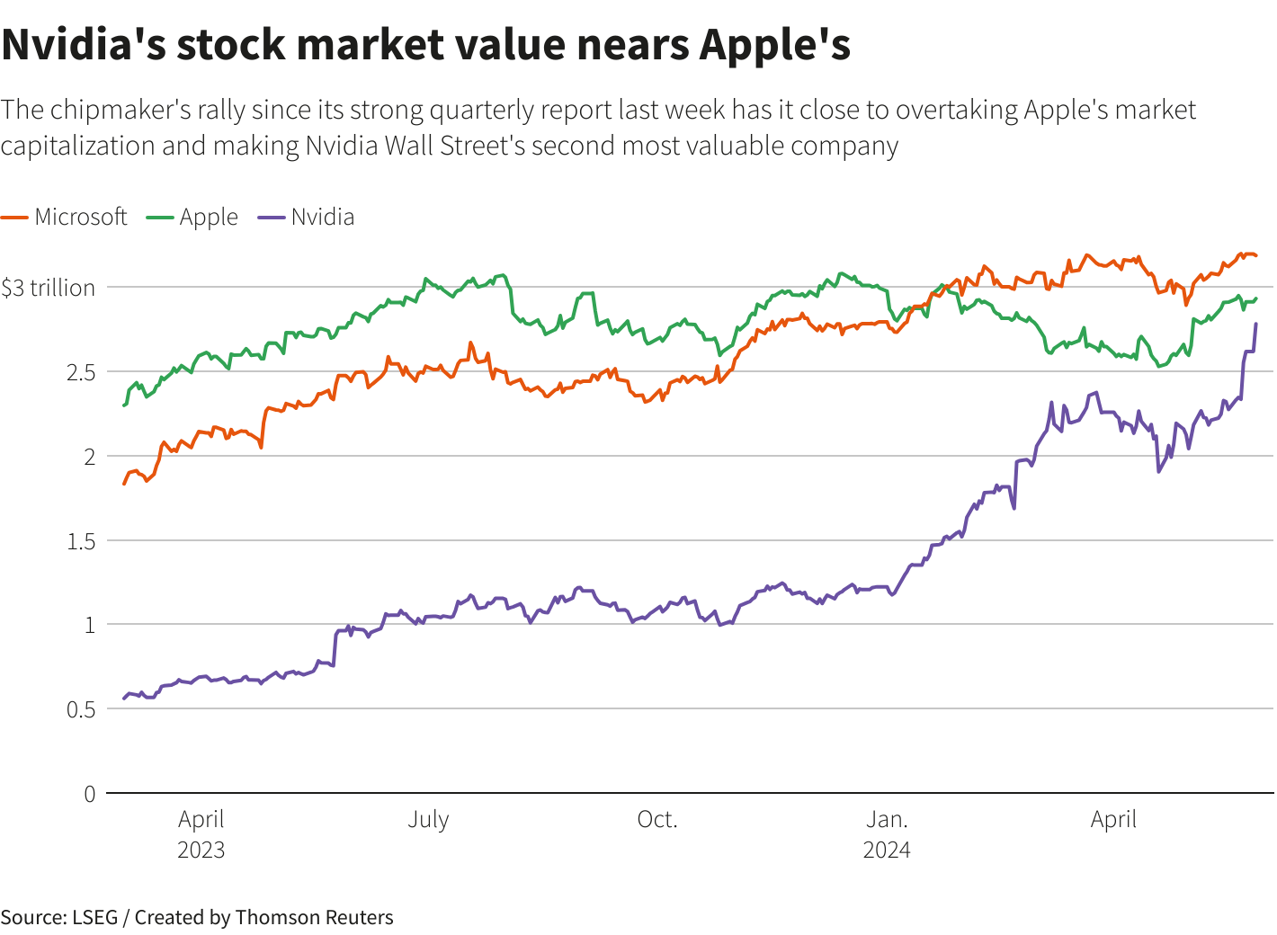 في آخر تداول عند 1128 دولاراً، وصلت القيمة السوقية لشركة "إنفيديا" إلى 2.8 تريليون دولار، مقارنةً بقيمة سوقية قدرها 2.9 تريليون دولار لشركة "أبل"، وهي ثاني أكبر شركة من حيث القيمة في "وول ستريت" بعد شركة "مايكروسوفت".