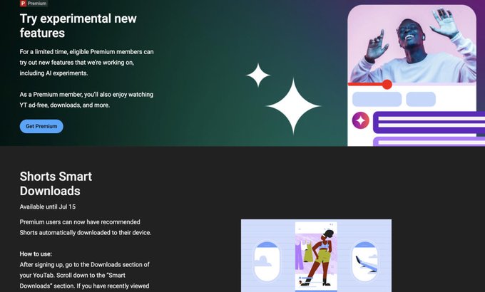 كما سيتمكن المستخدمون الذين يدفعون رسومًا من الوصول إلى أحدث الميزات التجريبية لموقع استضافة الفيديو أيضًا. وإحدى أحدث ميزات الاختبار على "يوتيوب" هي التحميلات الذكية لمقاطع الفيديو القصيرة، والتي تحفظ تلقائيًا مقاطع الفيديو القصيرة للخدمة على أجهزة المستخدمين، بحيث يمكنهم بعد ذلك مشاهدتها في وضع عدم الاتصال.