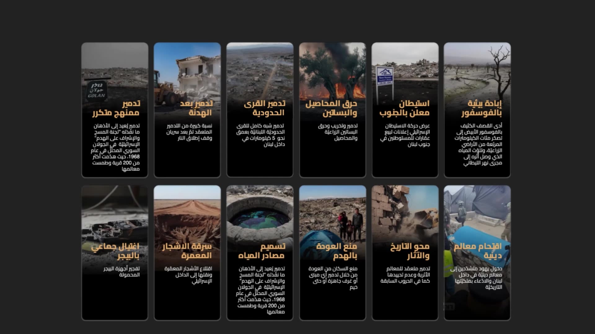 هذه عيّنة صغيرة من دمار أوسع وواقع أقسى، توثّق ما حلّ بعدد من قرى الجنوب اللبناني التي استهدفها الجيش الإسرائيلي، وتعمّد محو كلّ مقوّمات الحياة فيها.