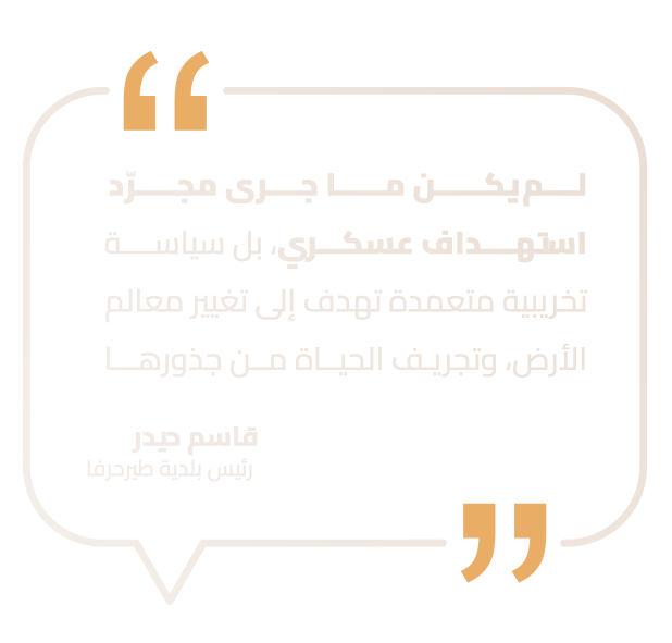 في وصفه لحجم الكارثة، يؤكد عواضة أن البلدة تكاد تكون مدمّرة بالكامل، إذ تجاوزت نسبة الدمار الكليّ الـ 90 في المئة، فيما تحتاج النسبة الباقية إلى عمليات ترميم أساسية. ويشدد على أن نحو 30 في المئة من البساتين الزراعية، ولا سيما أشجار الحمضيات والزيتون، تعرّضت للتلف الكامل، "في خطوة تُفسّر بأنها محاولة لمحو الذاكرة والهوية التاريخية للبلدة".
