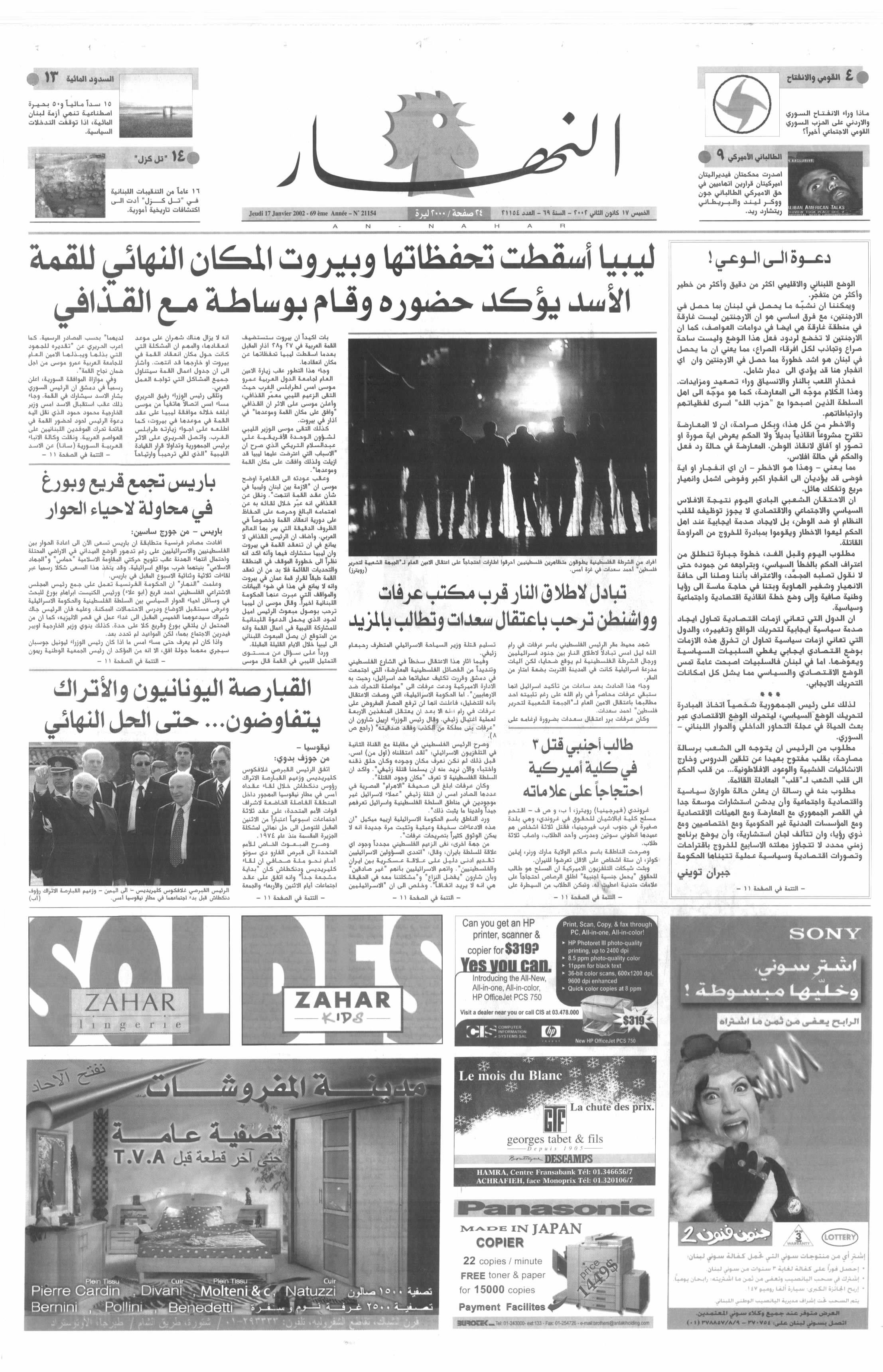 الصفحة الأولى من عدد 2002-01-17. (النهار)