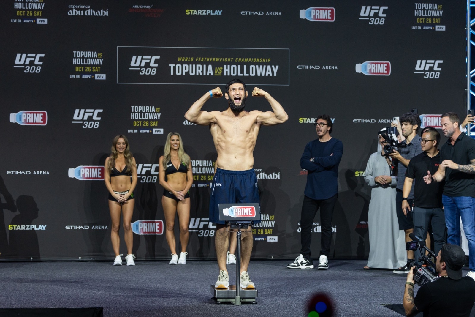 ساعات قليلة تفصل عشاق الفنون القتالية المختلطة عن بطولة يو إف سي 308: توبوريا ضد هولواي، الحدث الأبرز الذي تستضيفه الاتحاد أرينا مساء اليوم، وذلك بعد اختتام فعالية الوزن الرسمية أمس (الجمعة) ونجاح جميع الرياضيين الـ26 المشاركين في تحقيق الوزن المطلوب وسط حضور جماهيري كبير.