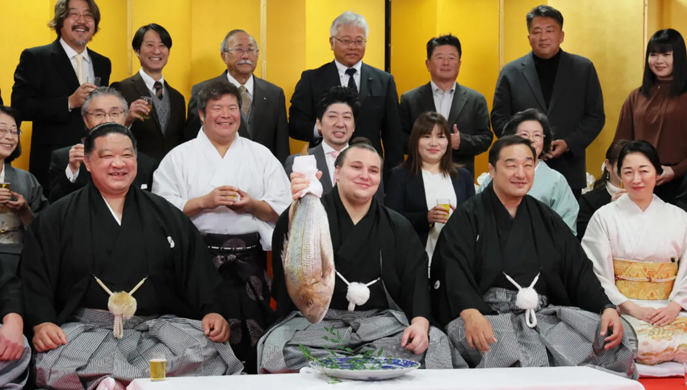 وحصل على ترقيته في حفل خاص بمدينة فوكوكا غرب اليابان، حيث انحنى أمام شيوخ السومو وسط شاشات ذهبية وزهور احتفالية.