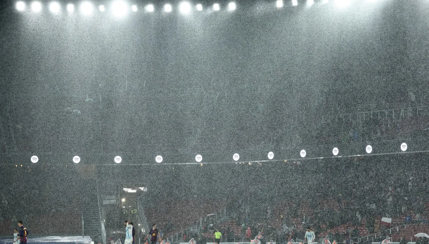 غير أن الأمسية تحولت إلى خيبة أمل حقيقية لنحو 45 ألف مشجع، بعدما كشفت الأحوال الجوية عن مشكلات إنشائية واضحة في المشروع المُحدّث. فمع بداية الشوط الثاني، أدت الأمطار الغزيرة إلى تسرب المياه من سقف المدرجات الجديدة، لتتحول بعض المناطق إلى مساحات مغمورة بالمياه، طالت الجماهير ووسائل الإعلام على حد سواء.