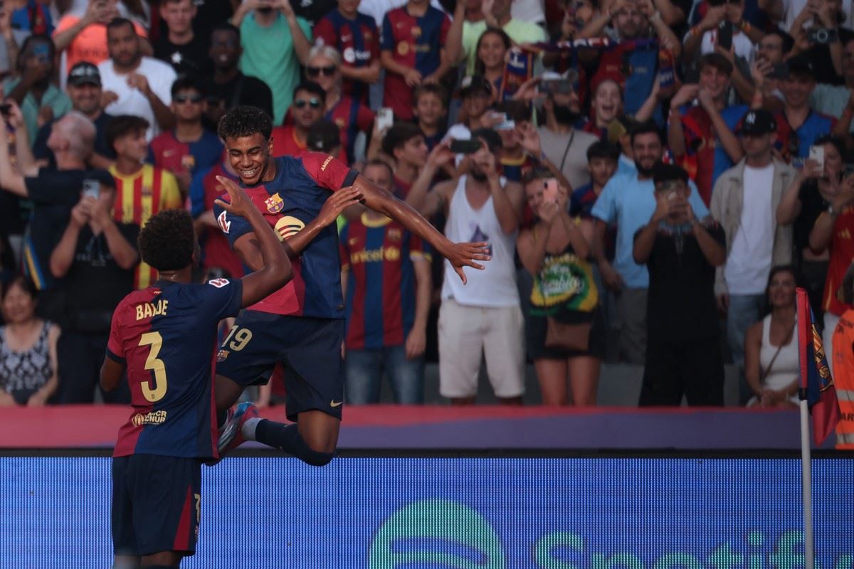 وعن عمر 17 سنة و68 يومًا لم يحتاج يامال إلى وقت طويل لفتح رصيده التهديفي في مسابقة دوري أبطال أوروبا ليوقّع على أول أهدافه بها، فبعد أن استلم تمريرة عالية، قطع الكرة من اليمين وسددها بقدمه اليسرى في الزاوية اليمنى السفلية من مسافة 20 ياردة.