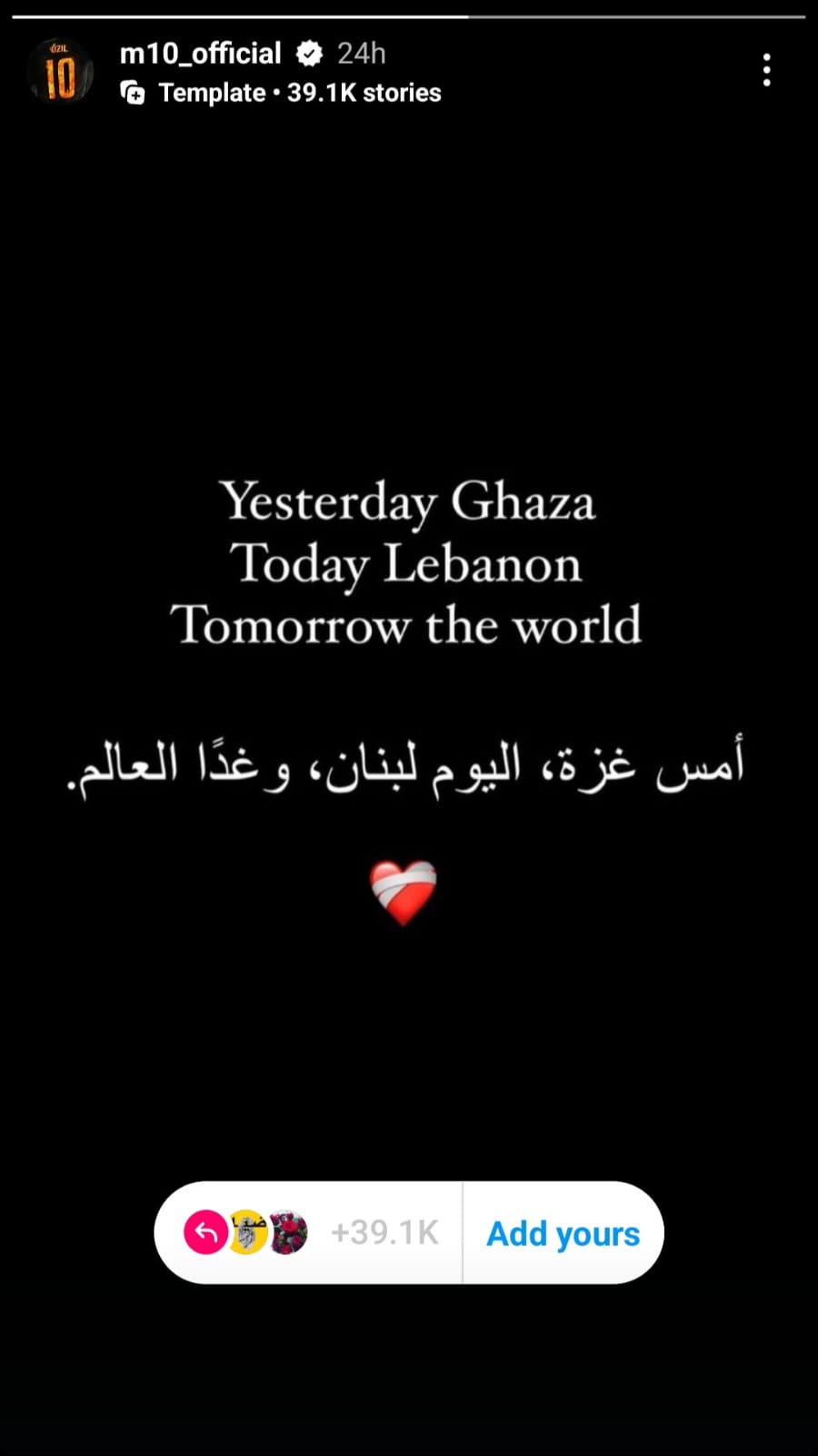 ونشر أوزيل (35 عاماً) الذي اعتزل اللعب مع المانشافت عام 2018 "ستوري" على حسابه الرسمي على منصة إنستغرام: "أمس غزة، اليوم لبنان، وغداً العالم".