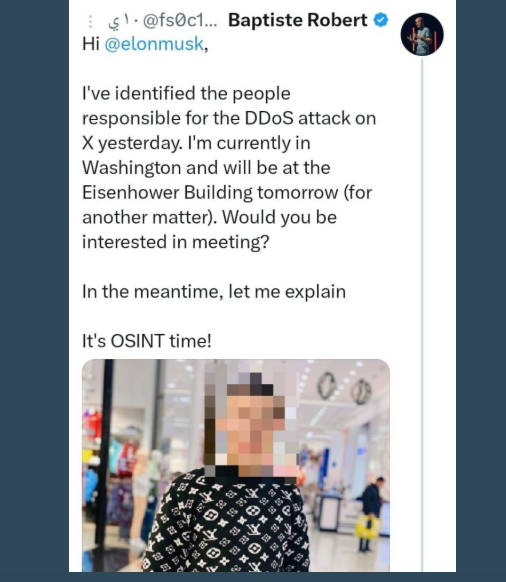 اتهم الرئيس التنفيذي لشركة التحقيقات الأمنية "OSINT" بابتيست روبرت الطالب المصري محمد هاني بالوقوف خلف الهجوم السيبراني الذي استهدف منصة "إكس" وتسبب في انقطاع مفاجئ أثر على آلاف المستخدمين حول العالم، في أكبر هجوم تعرضت له المنصة في تاريخها، وفقاً لمالك المنصة إيلون ماسك.